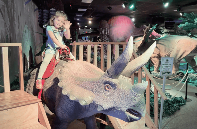 Climb aboard our big, realistic coin-op Triceratops and take a fun ride — a prehistoric photo op kids will love.