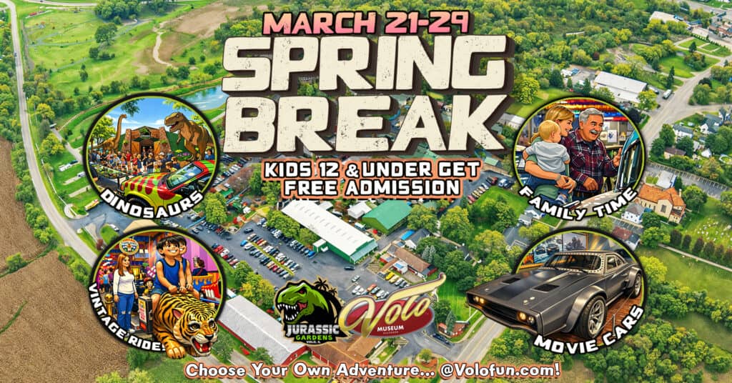 Make it a Spring Break to remember at Volo Museum & Jurassic Gardens! From March 21–29, kids 12 and under receive a FREE Gold Pass—yes… FREE—with admission to BOTH Volo Museum & Jurassic Gardens!.