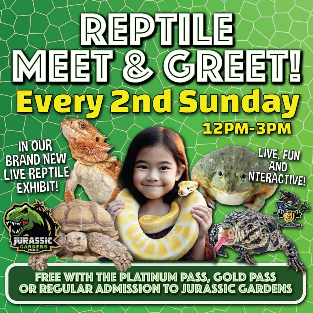 EVERY 2ND SUNDAY OF THE MONTH! Inside of the brand new, permanent, live reptile exhibit at Jurassic Gardens, our friends from Scale World Order will be performing an interactive, educational and entertaining reptile meet and greet!