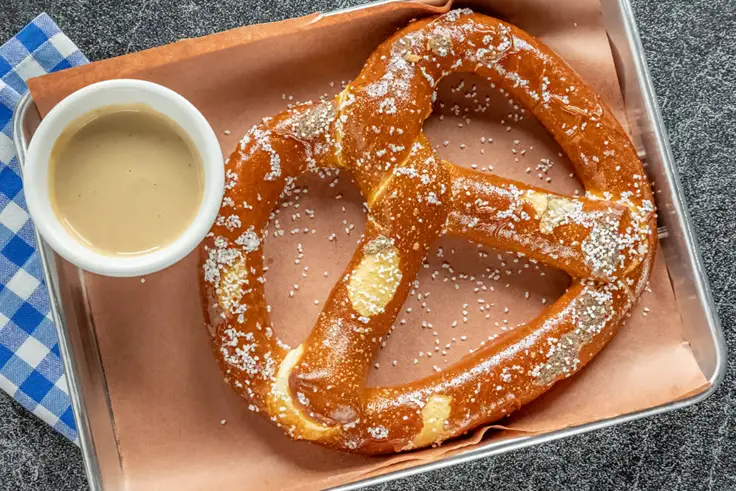 A warm jumbo pretzel paired with rich, cheesy dip.
