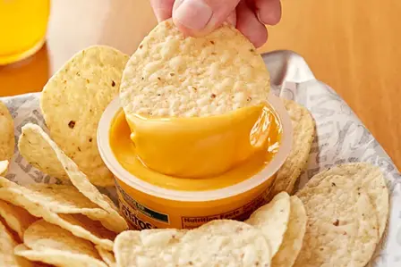 Crunchy nachos with a cup of warm, cheesy dipping sauce.